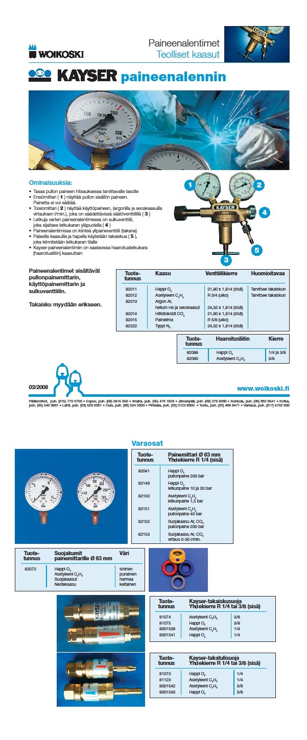 - Suositellaan sulkuventtiilillä varustettua paineenalenninta ESIM: Kayser-paineenalennin . Sulkuventtiilillä varmistetaan sovitelman turvallinen käyttö, paineastiaa ei tarvitse irroittaa mittarista käyttökertojen välissä.