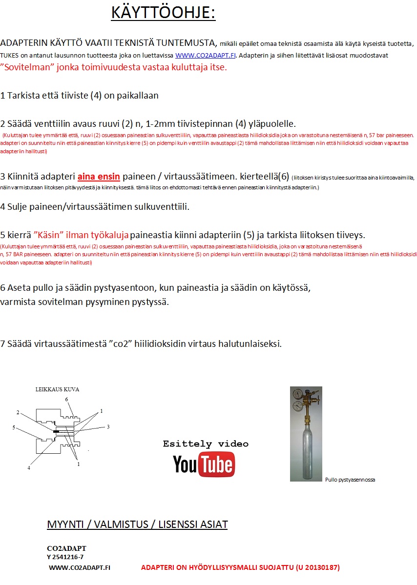 - Adapterin mukana toimitettu tiiviste on saugertiiviste kumia (1/2tuumaa). Tiivisteitä on saatavilla Verkkokaupasta (WWW.CO2ADAPT.FI)